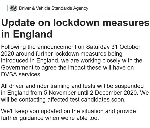 Driving Lessons and Tests to be suspended from 5th Nov