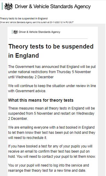 Please see below a statement from the DVSA regarding the continuing suspension of THEORY TESTS.
